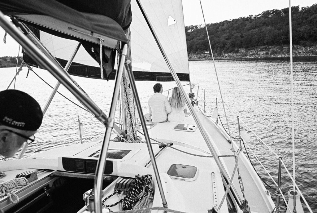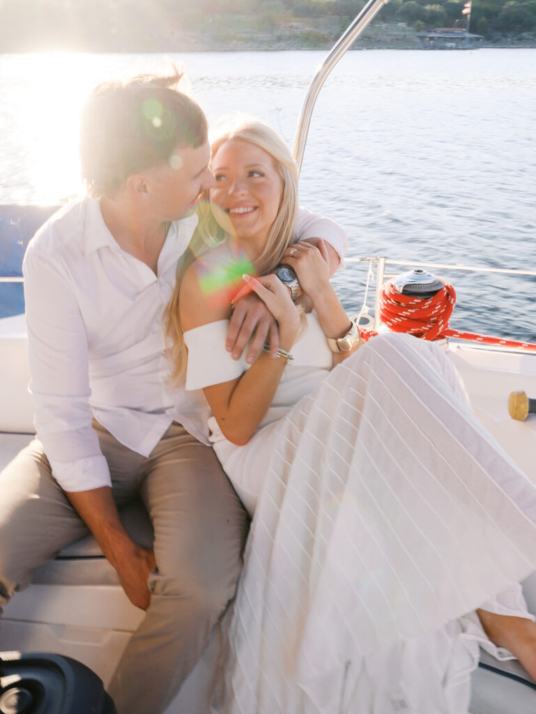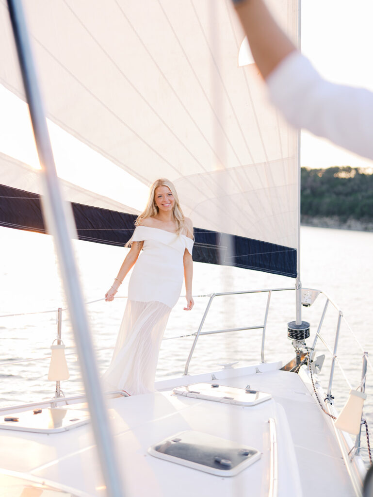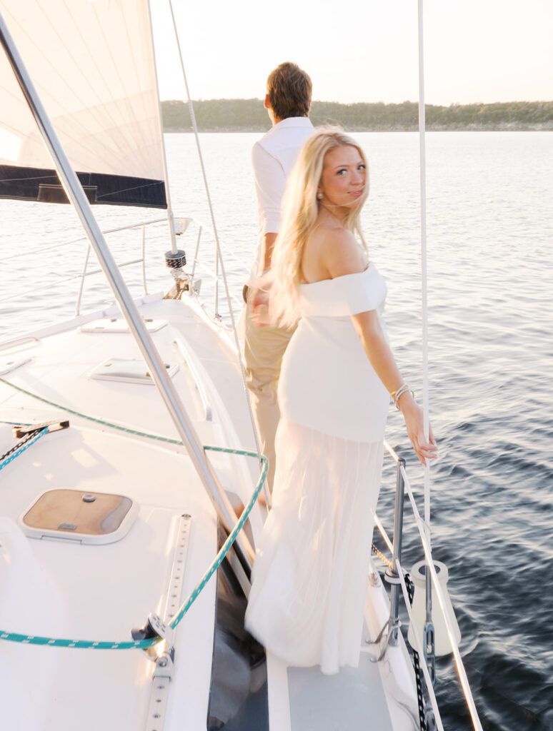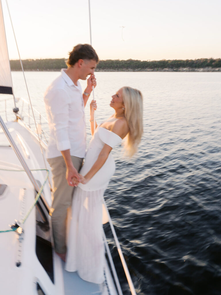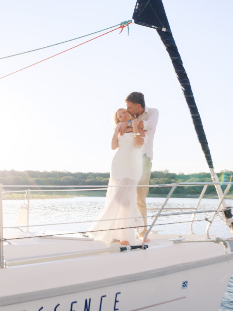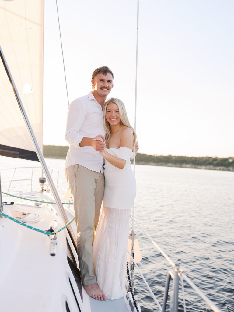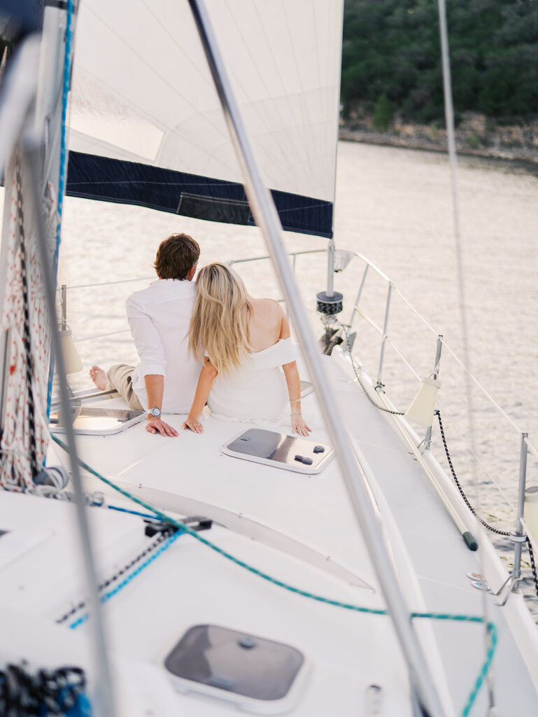 Lake Travis gave us everything – golden hour light, a fiery sunset, and even a glowing moon that set the perfect mood. With champagne on deck, laughter in the air, and the sailboat as their backdrop, every moment felt both fun and intimate.