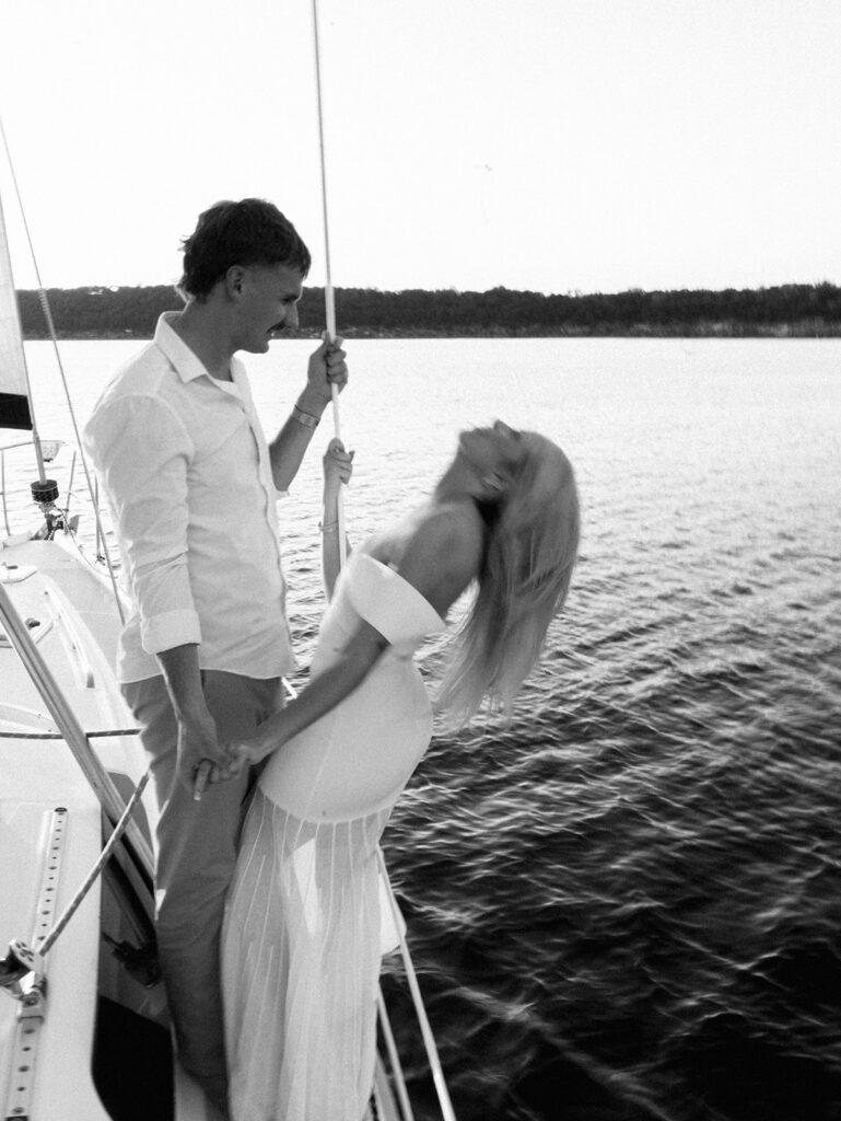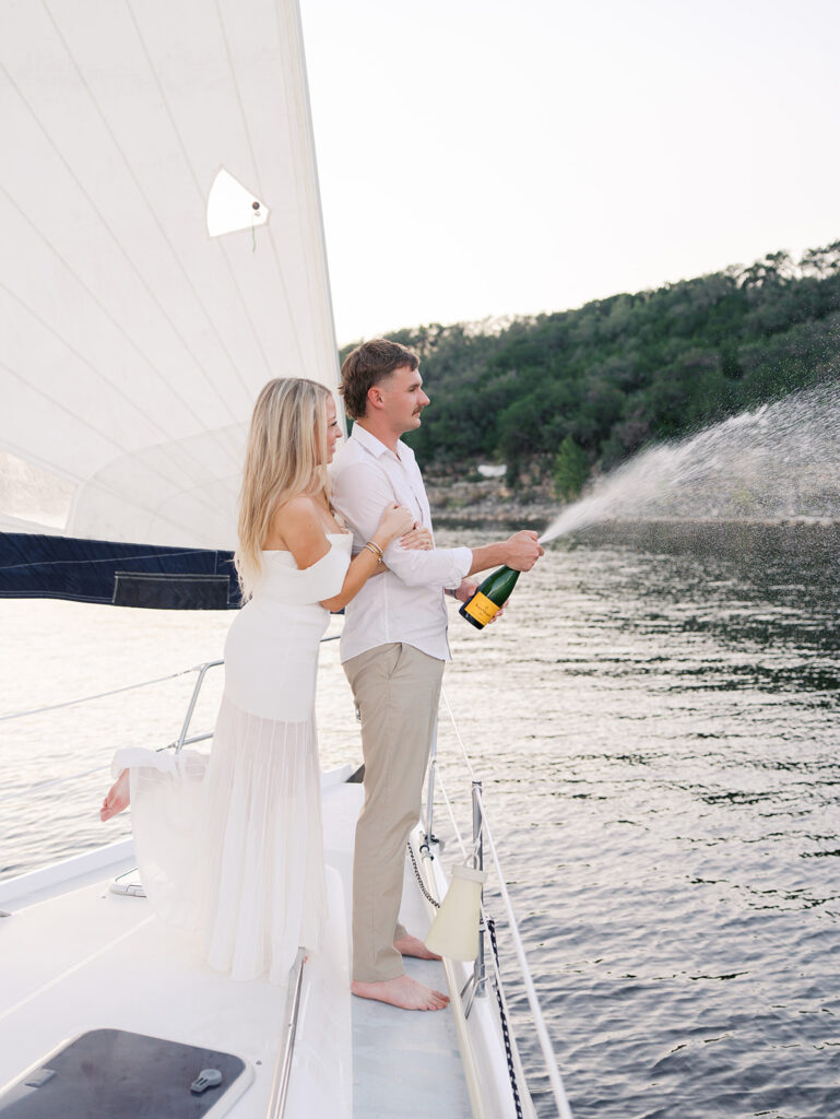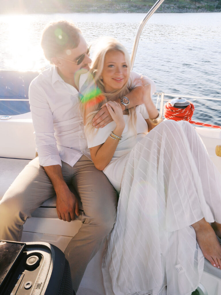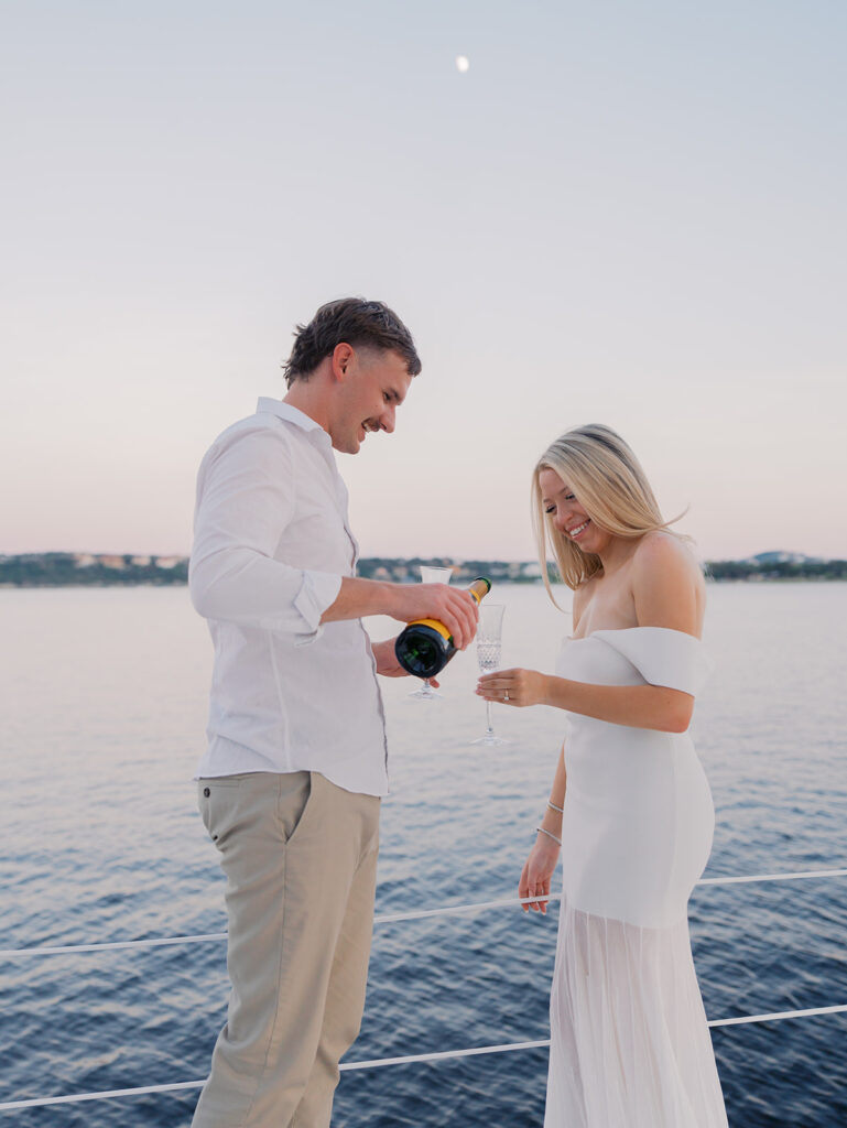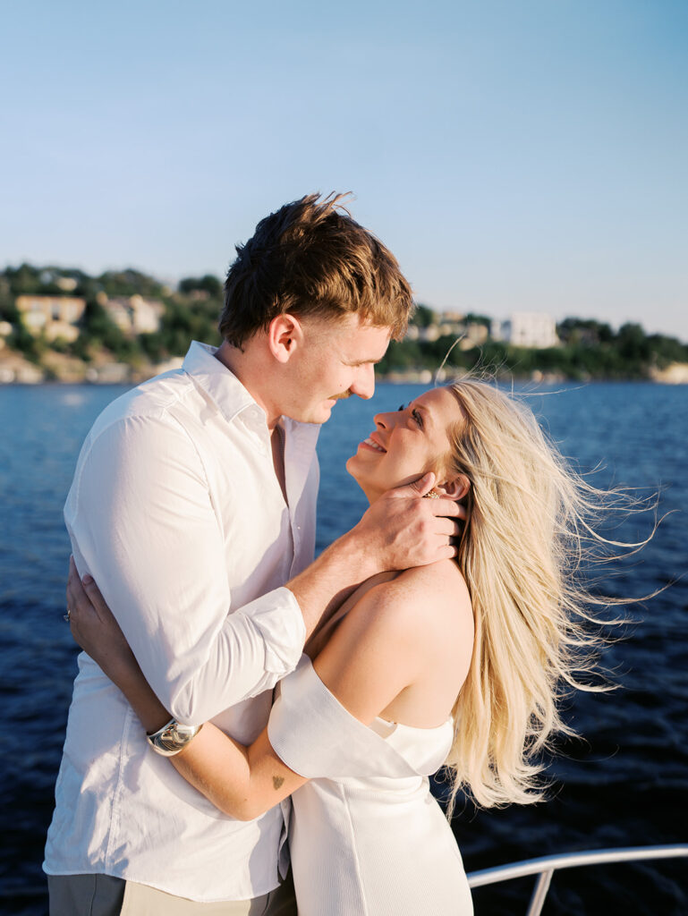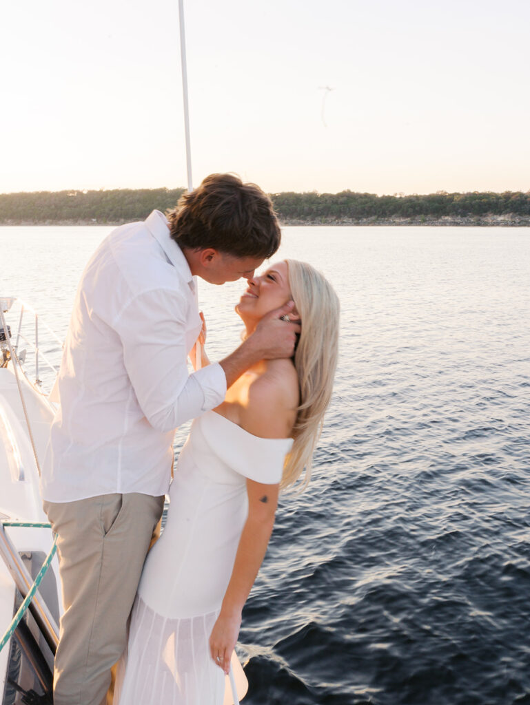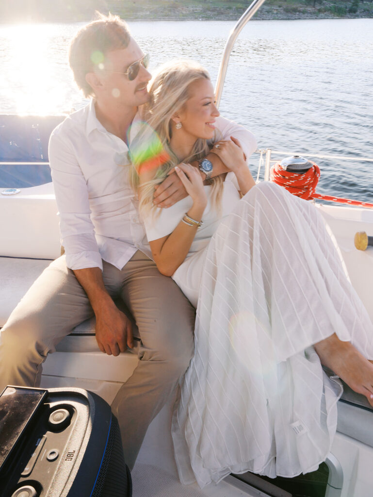 Lake Travis gave us everything – golden hour light, a fiery sunset, and even a glowing moon that set the perfect mood. With champagne on deck, laughter in the air, and the sailboat as their backdrop, every moment felt both fun and intimate.