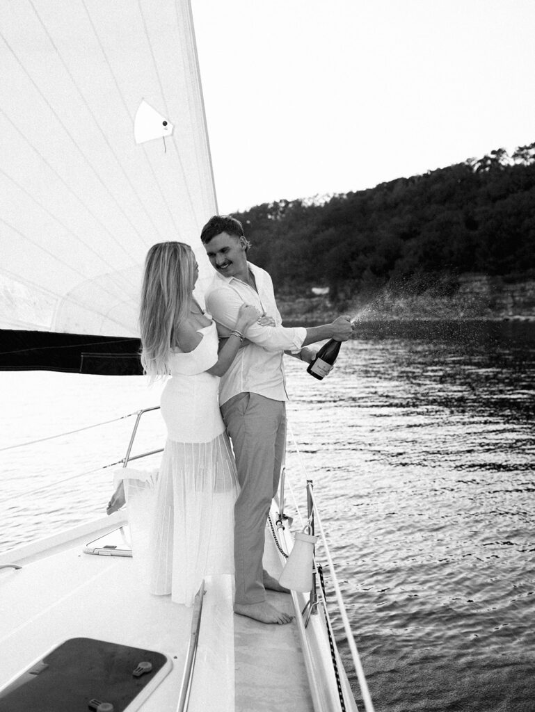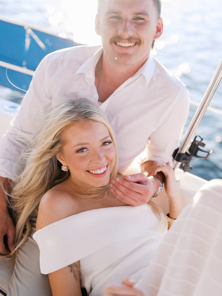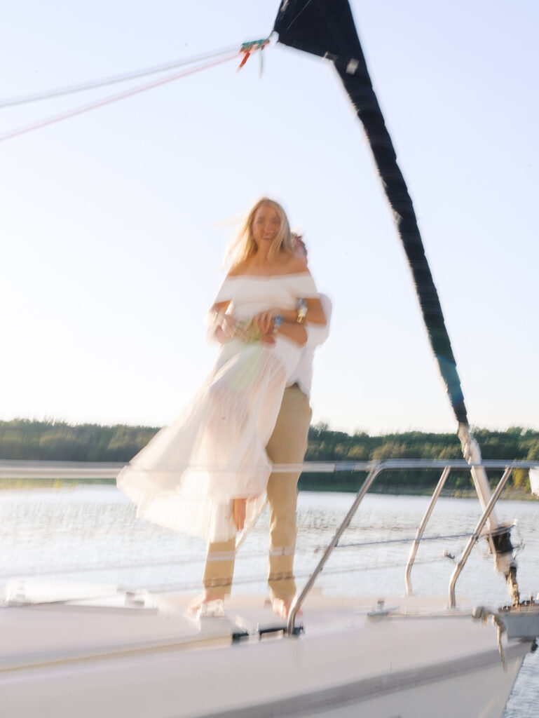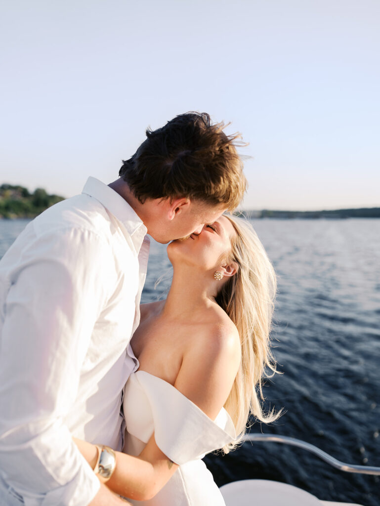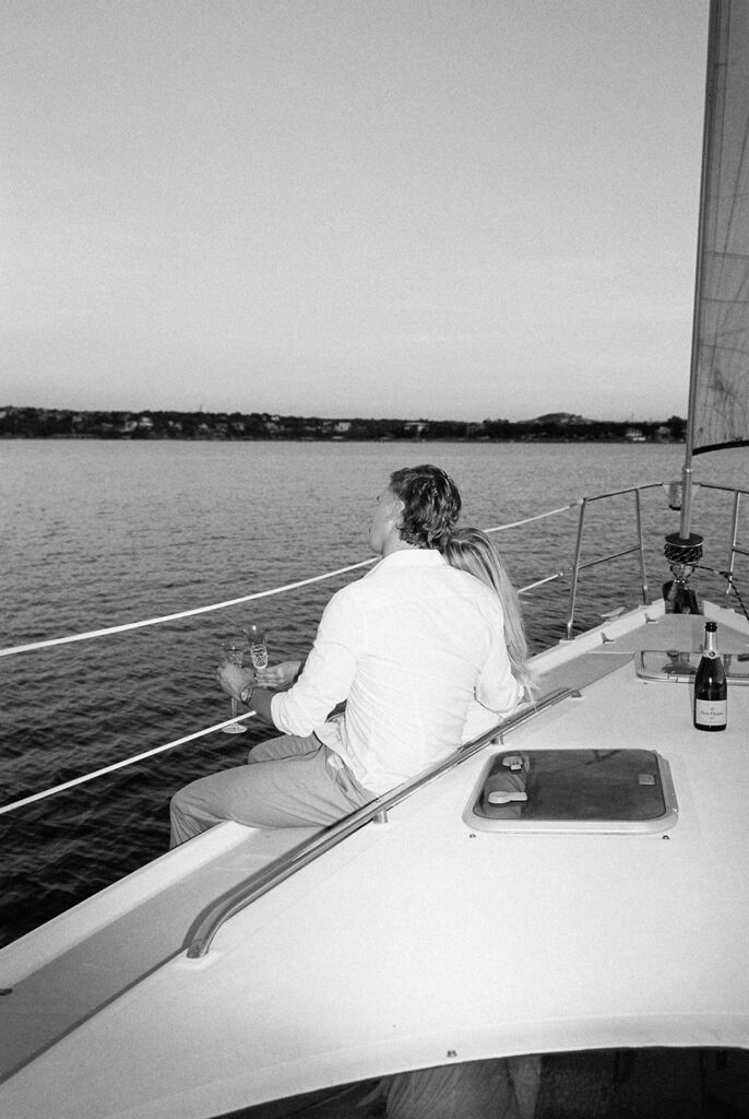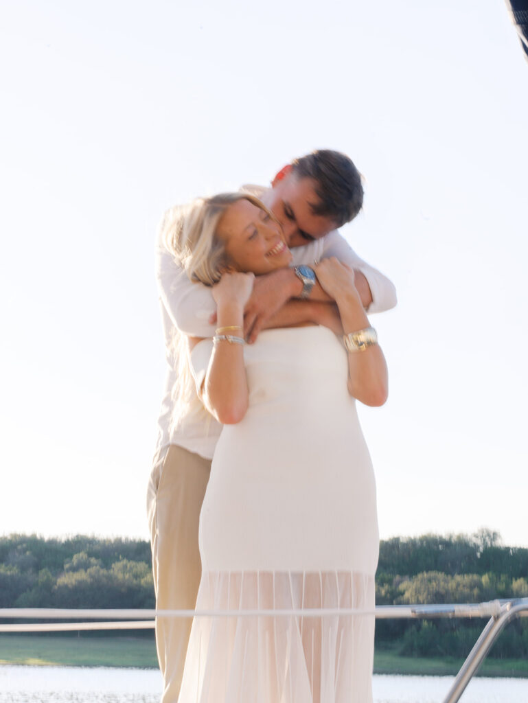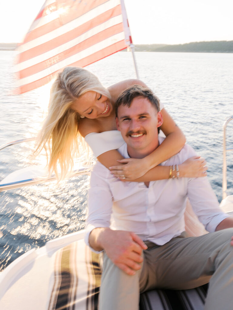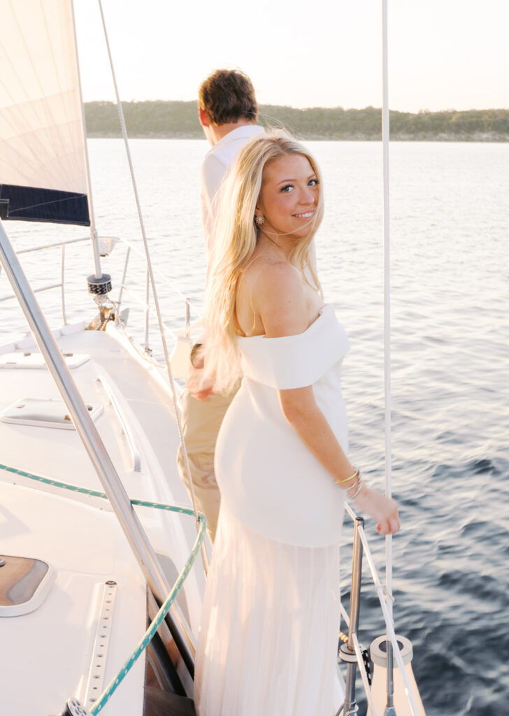 Lake Travis gave us everything – golden hour light, a fiery sunset, and even a glowing moon that set the perfect mood. With champagne on deck, laughter in the air, and the sailboat as their backdrop, every moment felt both fun and intimate.