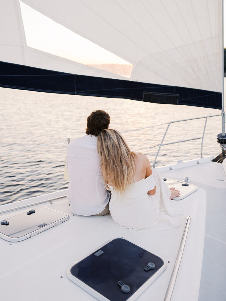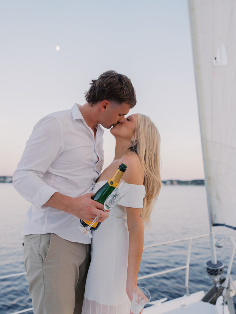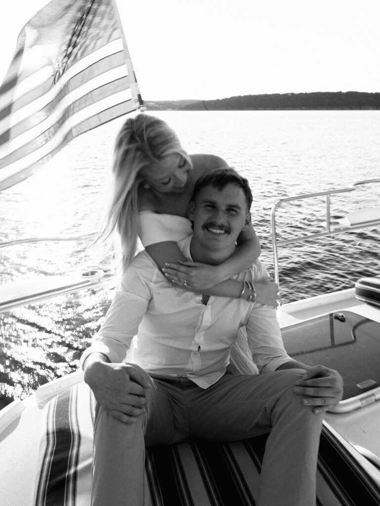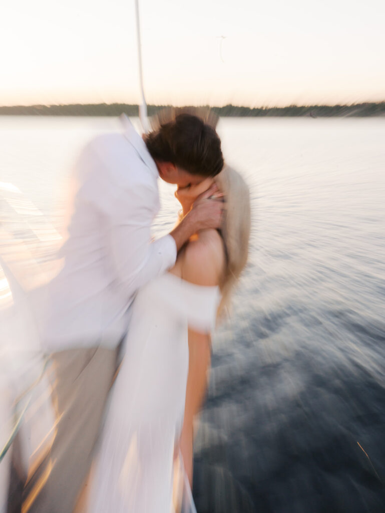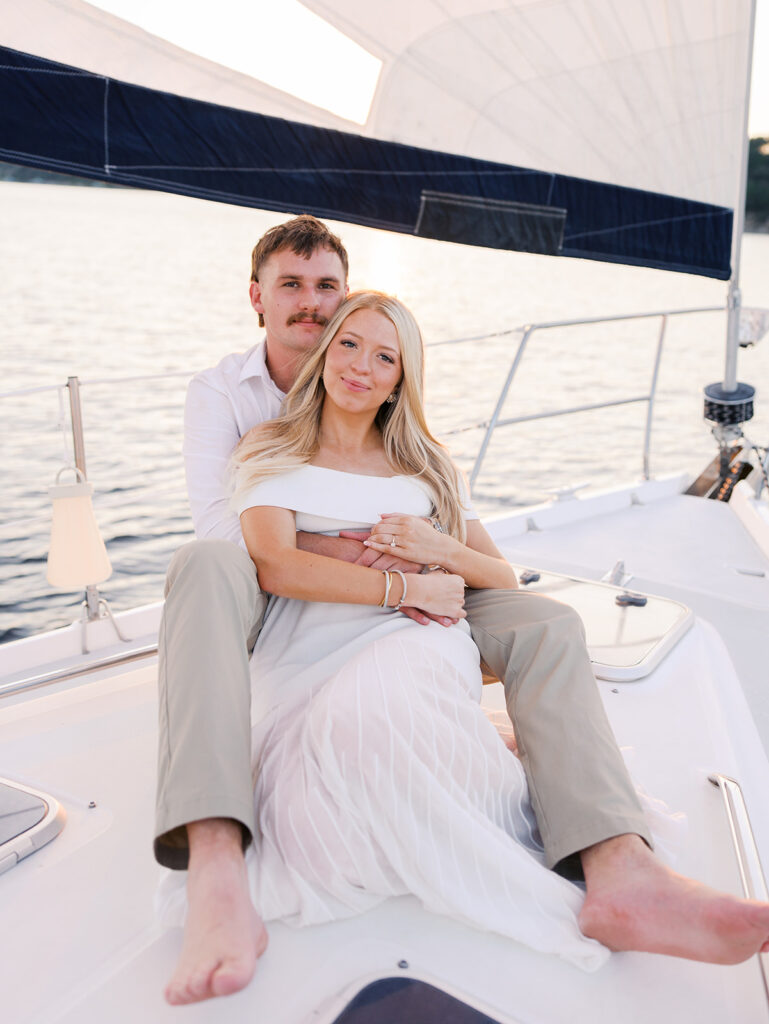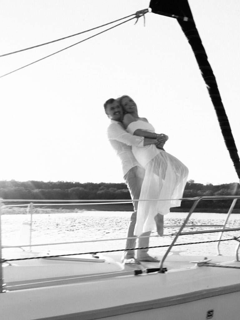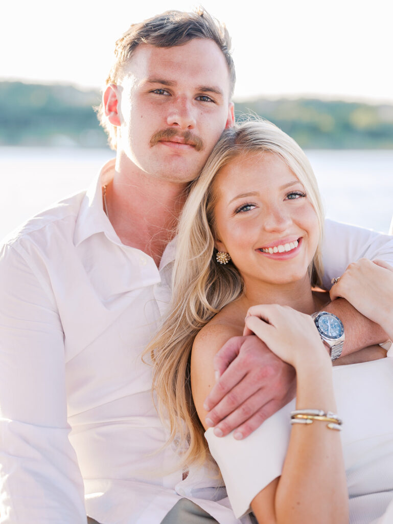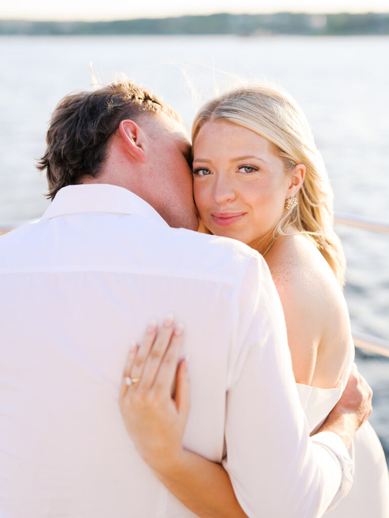 Lake Travis gave us everything – golden hour light, a fiery sunset, and even a glowing moon that set the perfect mood. With champagne on deck, laughter in the air, and the sailboat as their backdrop, every moment felt both fun and intimate.