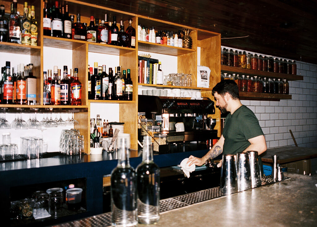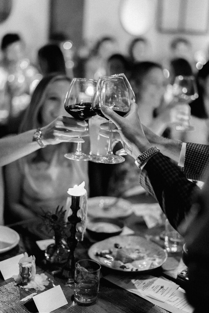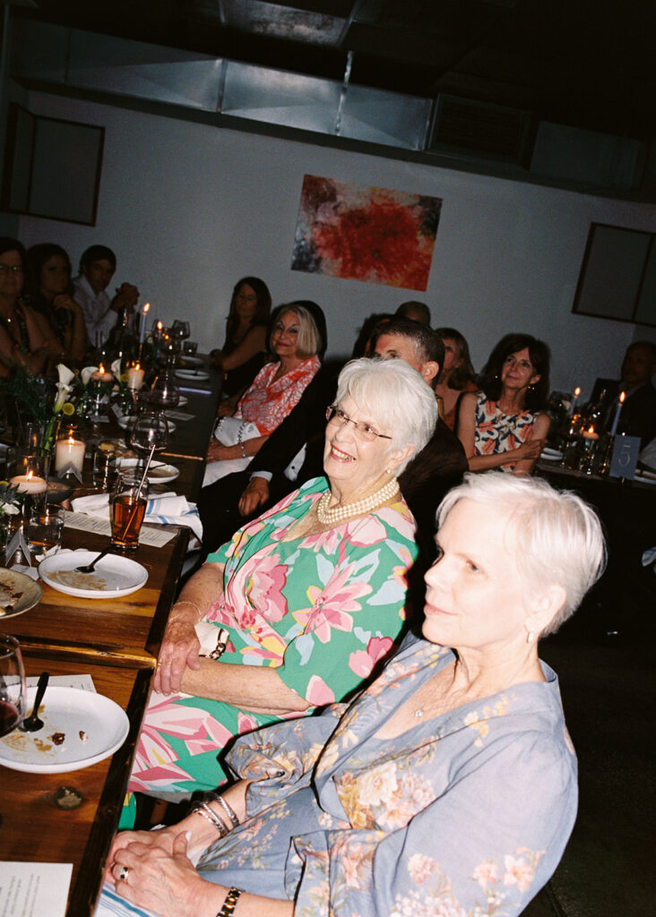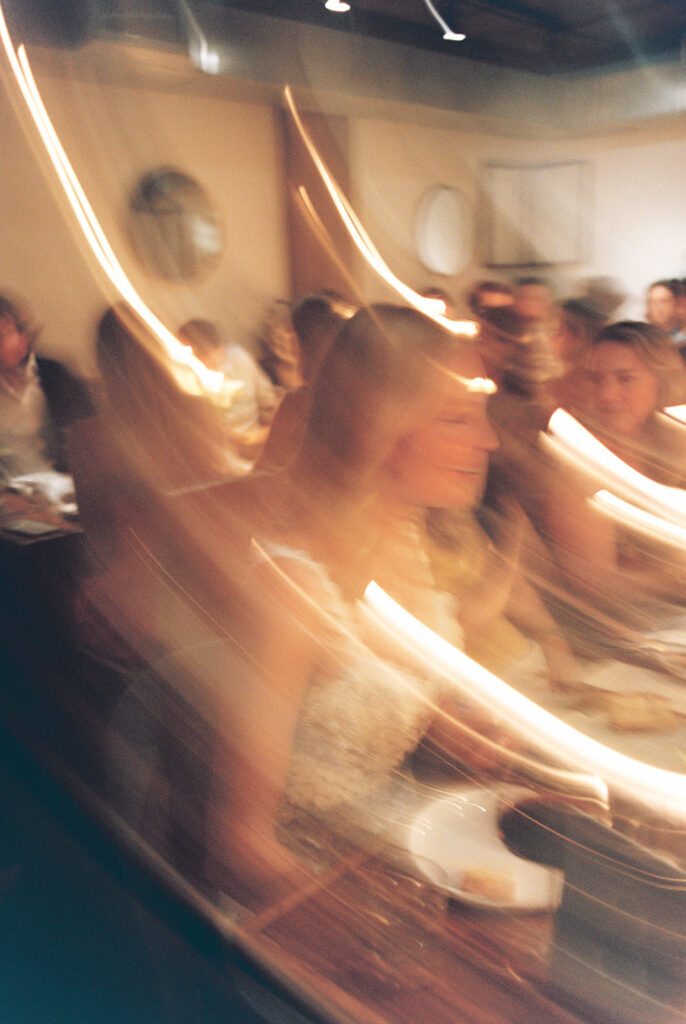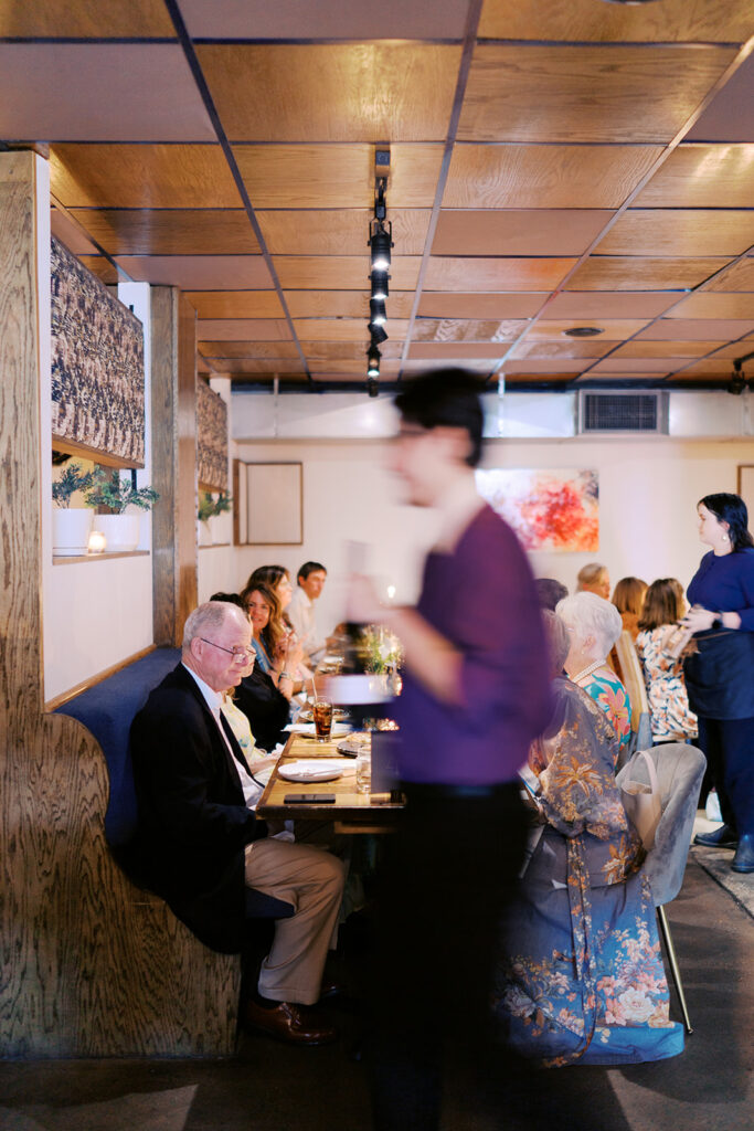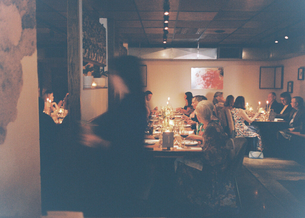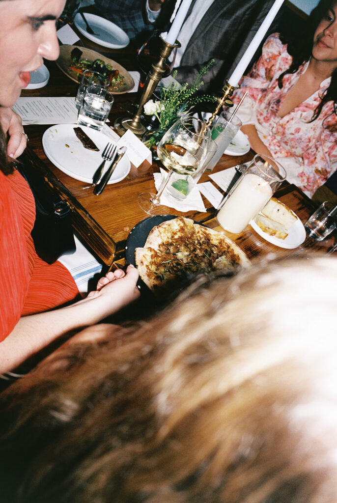 Film photograph of rehearsal dinner guests enjoying an intimate evening at Intero Restaurant.