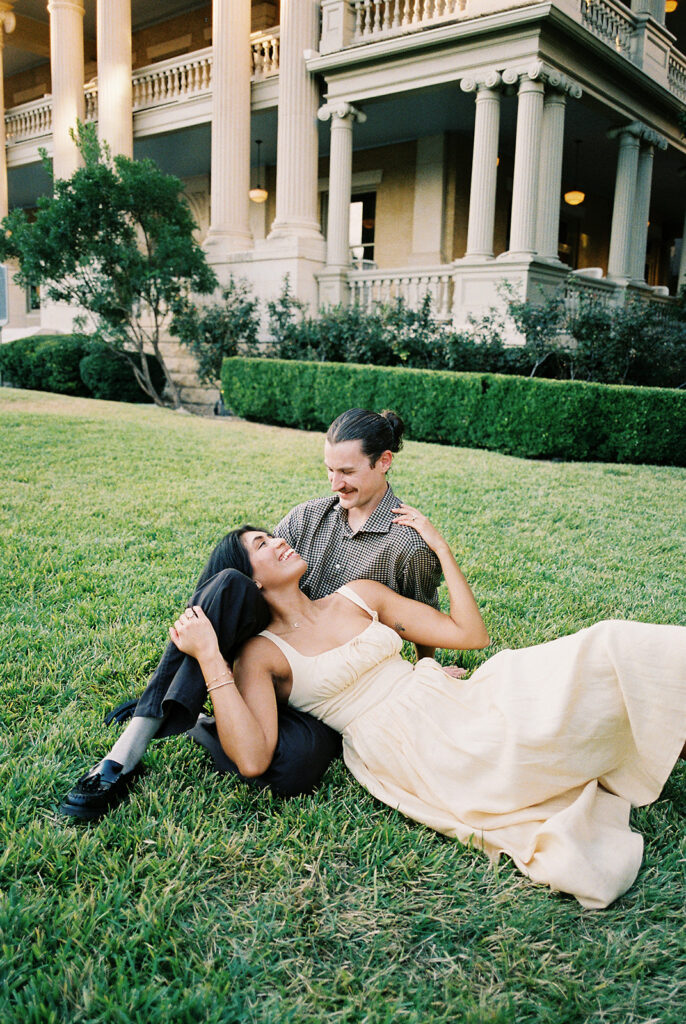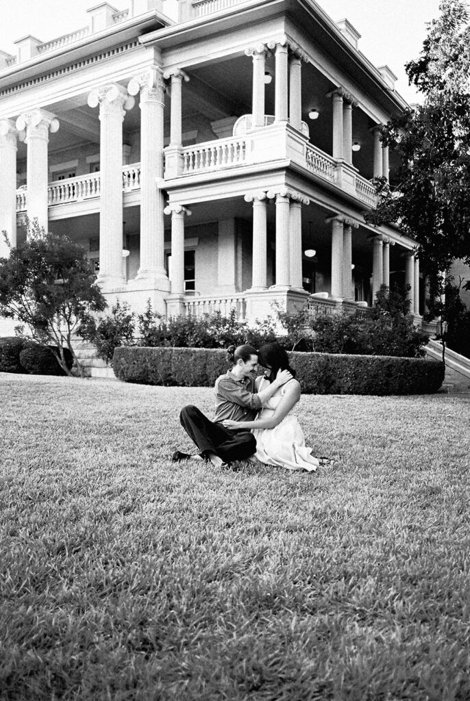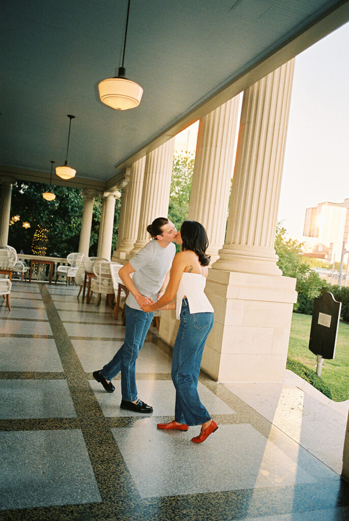 We explored the historic architecture, romantic courtyards, and soft light filtering through the trees. Emily and Ross were completely at ease, and their chemistry made every frame feel natural and genuine. The session was a mix of film and digital, giving their gallery a dreamy blend of warmth, texture, and color that perfectly captured their love.