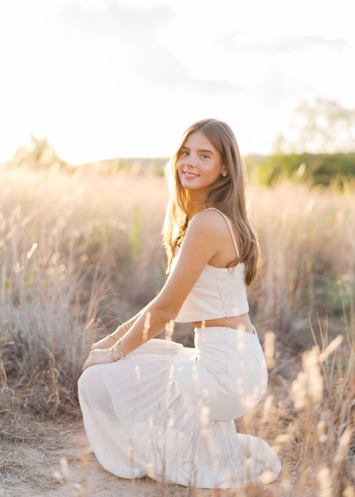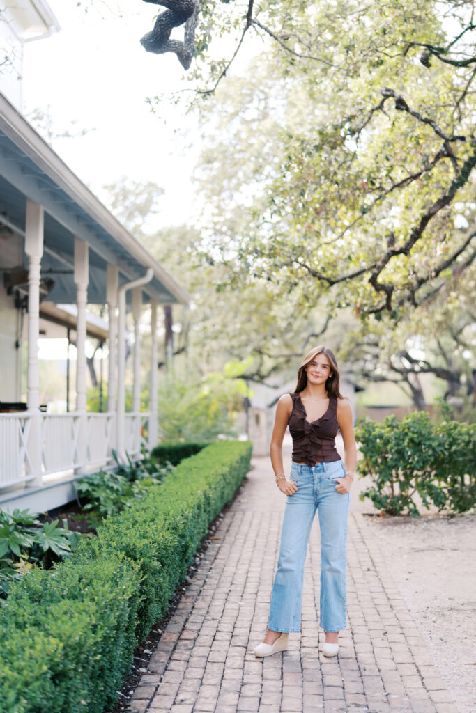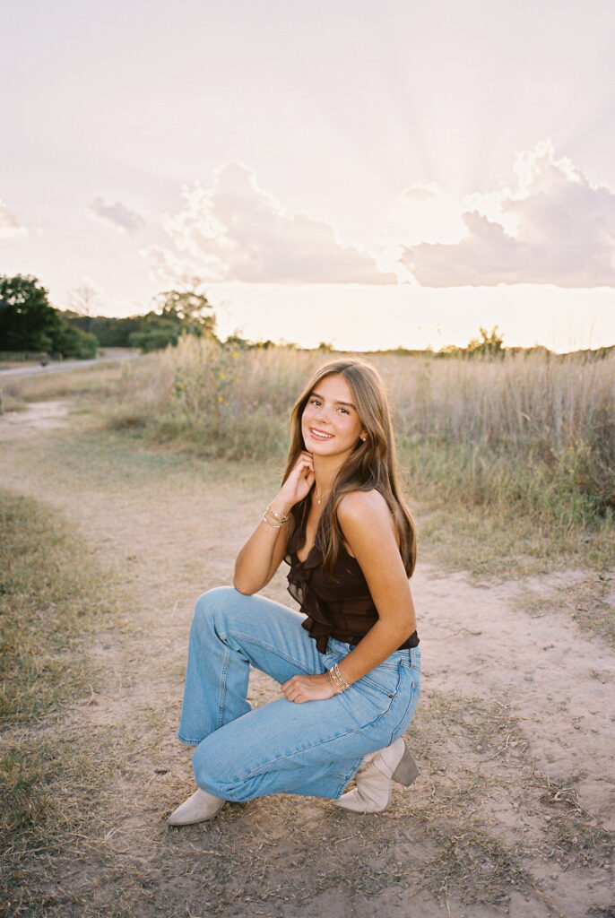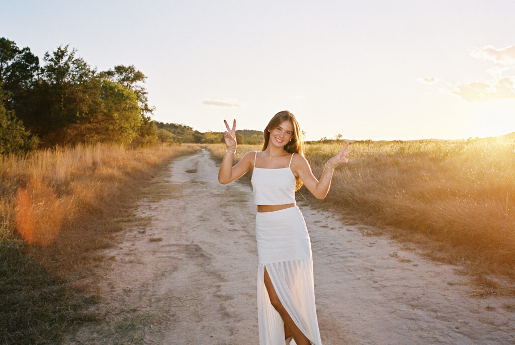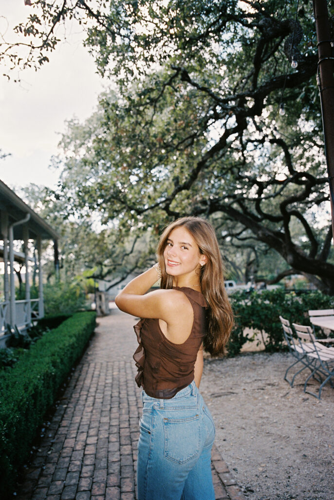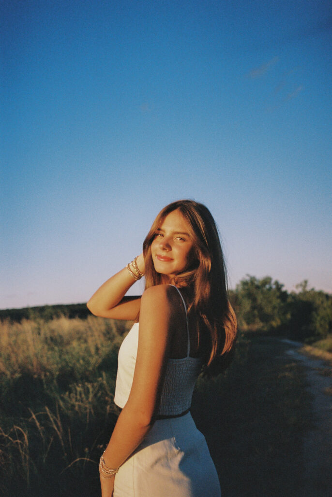 Absolutely in love with Julep’s senior session – we started at Mattie’s, where the oak trees and classic white exterior bring that elegant, timeless feel. Then we headed out to Commons Ford for that golden, outdoorsy glow that only Texas evenings can give. It’s the perfect combo if you want something a little bit dressy and a little bit outdoorsy.